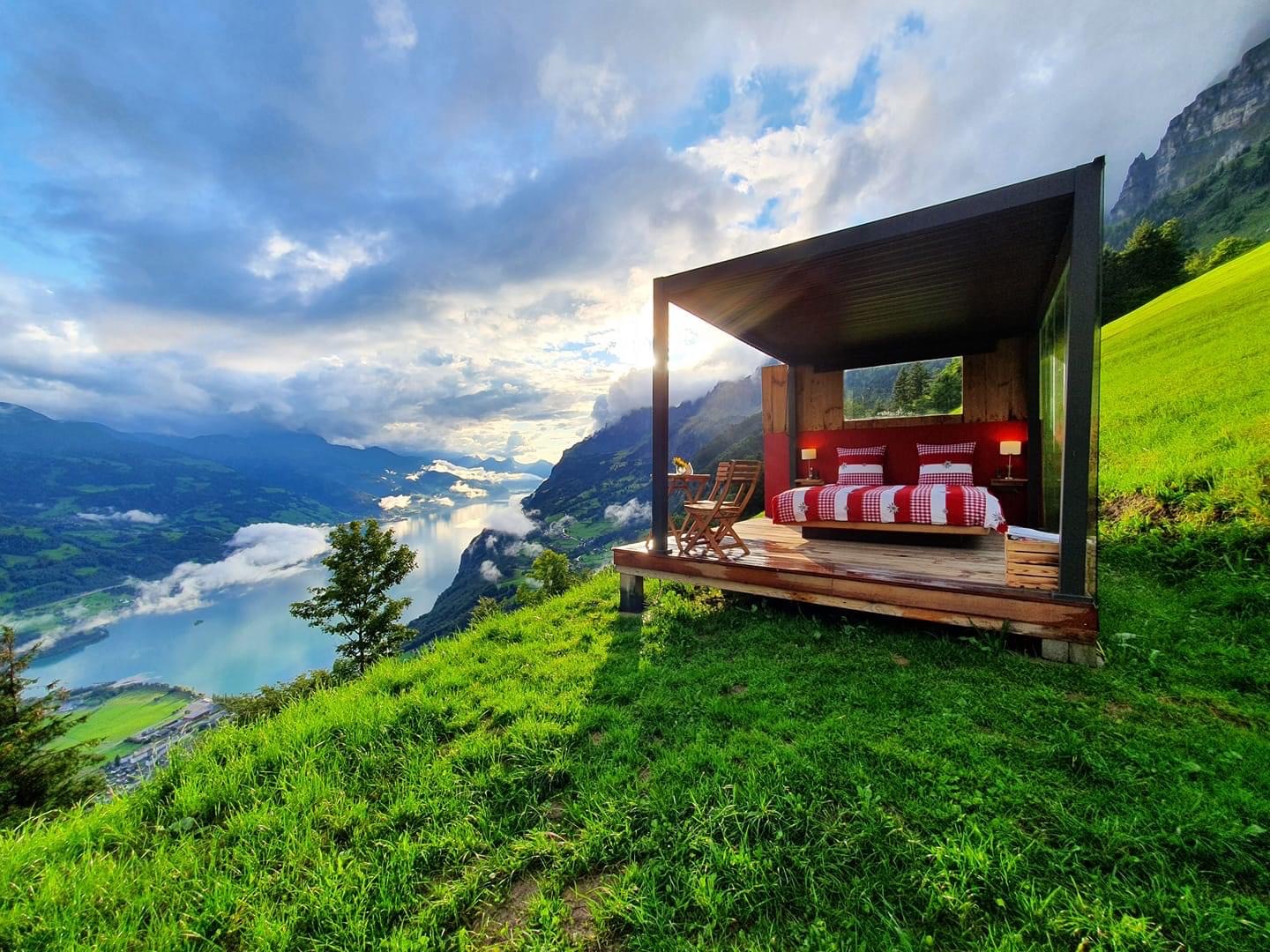 Erleben Sie eine einzigartige Nacht in unserer Lüsis Suite oberhalb von Walenstadt. Auf einer Holzplattform, gedeckt von einer Pergola die den Regen abhält, schlafen Sie windgeschützt von einer Glaswand auf einem Wasserbett. Mitten in einer Blumenwiese mit Blick auf den Walensee & das Sarganserland geniessen Sie die atemberaubende Aussicht & die frische Bergluft auf 1300 M.ü.M. Sollte es stark stürmen oder regnen, besteht die Möglichkeit im Berggasthaus die Nacht zu verbringen. Dusche & Toilette dürfen Sie ebenfalls im Berggasthaus (ca. 30m entfernt) benutzen. Falls Sie Abends hungrig sind – nehmen Sie doch ein leckeres Abendessen auf unserer gemütlichen Terrasse ein. Wir bereiten alle Speisen mit viel Liebe auf dem Holzkochherd zu.