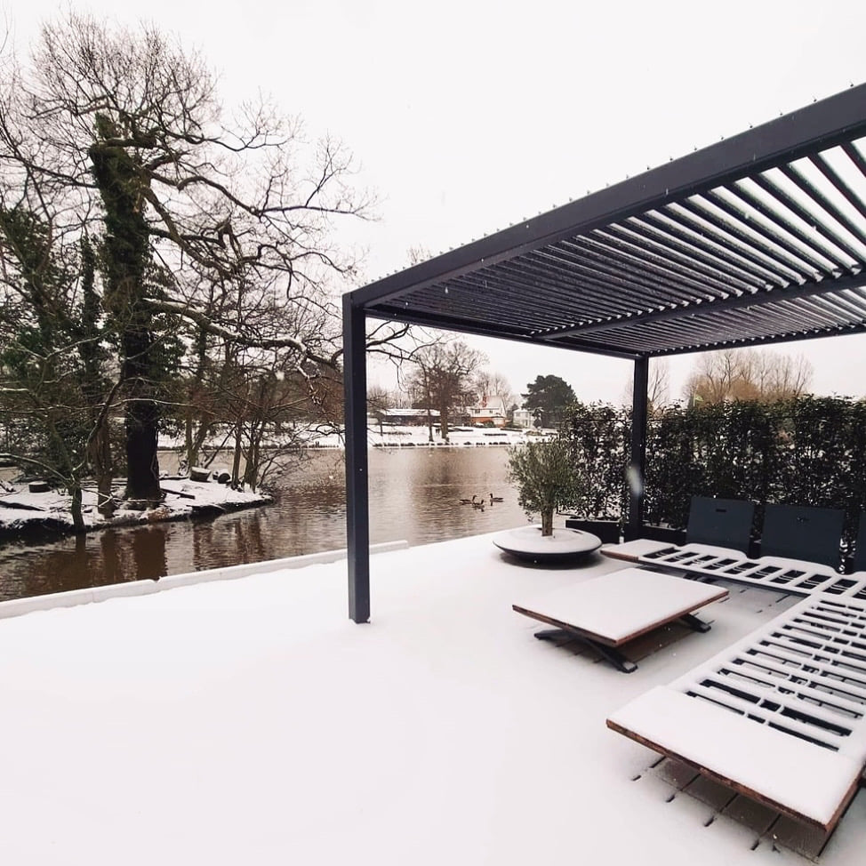 Wir empfehlen, die Dachlamellen der Pergola im Winter senkrecht aufzustellen, dadurch kann alles gut abtauen und es friert nichts ein.
