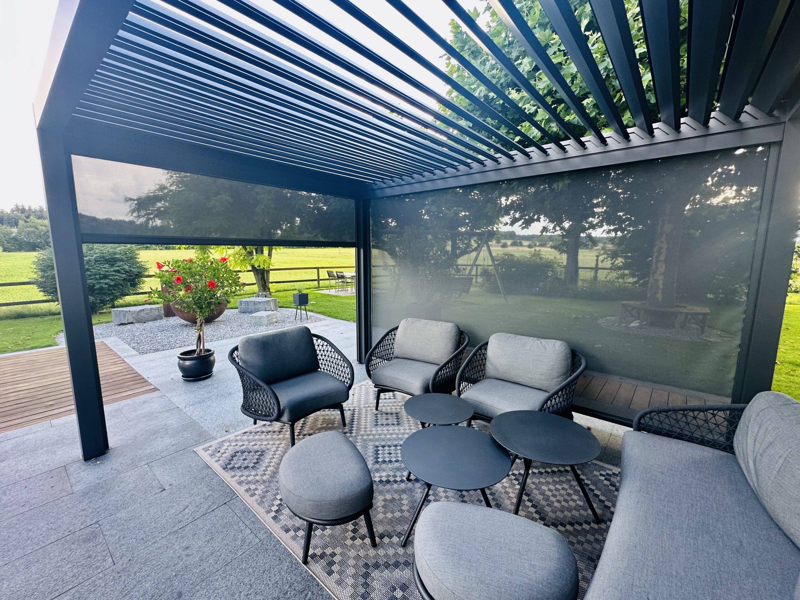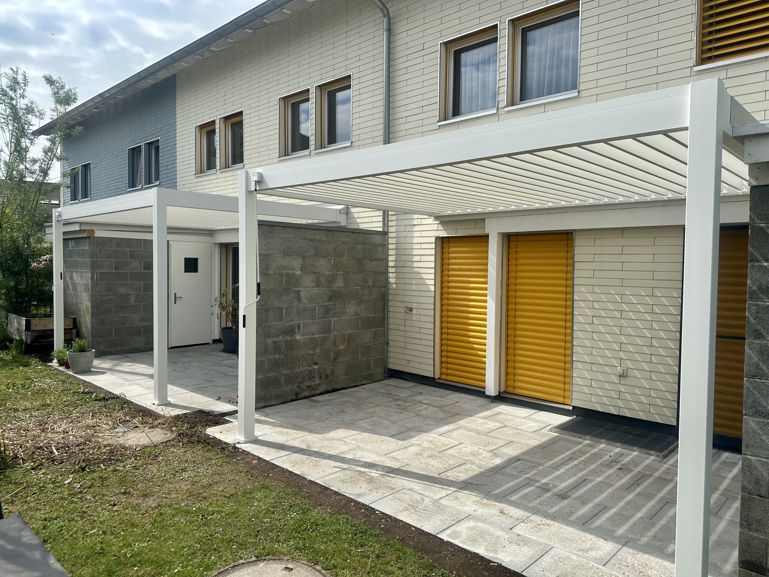 Terrassenbeschattung Pergola-Markisen bieten dank ihrer stabilen Bauweise einen zuverlässigen Schutz vor sanften Abendwinden und neugierigen Blicken oder Regen. So können Sie die Outdoor-Saison verlängern und Ihre Zeit im Freien ungestört genießen. Ergänzt mit Seitenrollos für noch mehr Wind- und Sichtschutz. Herzlichen dank für den Auftrag im schönen Thurgau!