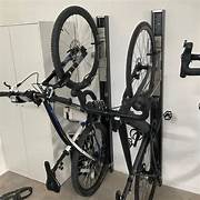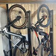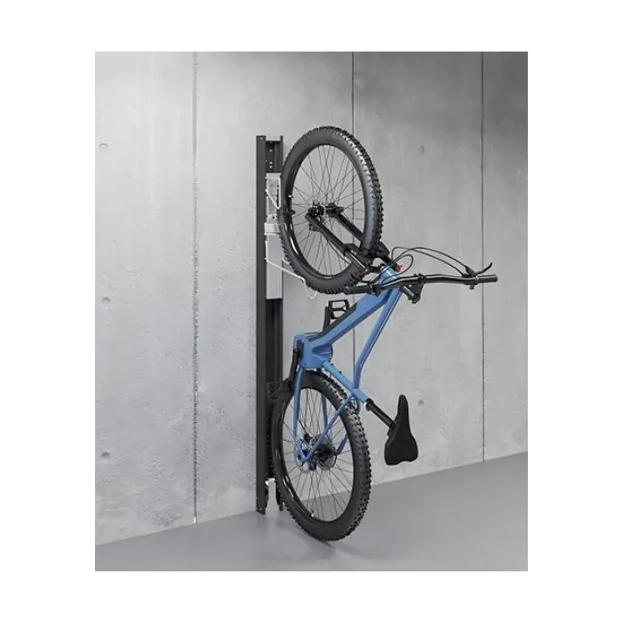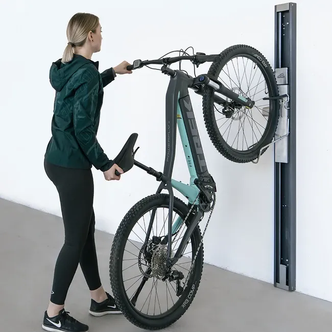 Sicher fixiert und bei Bedarf zusätzlich versperrbar hängt das Fahrrad platzsparend senkrecht an der Wand.