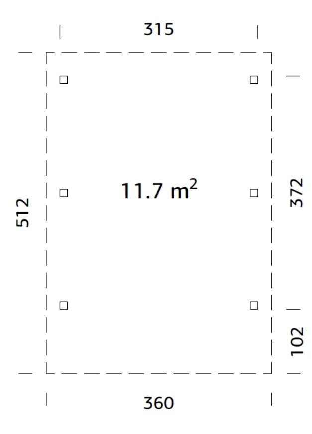 Das Carportdach ist flach gestaltet und hat eine Fläche von 11,7 m² (Dachfläche von 18m². Die Dachstärke beträgt 19 mm, was für ausreichende Stabilität sorgt. Der Dachüberstand von 102 cm sorgt dafür, dass auch die darunter liegenden Flächen gut geschützt sind. Das Dachgefälle ist so angelegt, dass das Wasser nach hinten abgeleitet wird, wodurch es keine Pfützenbildung an der Vorderseite des Carports gibt.