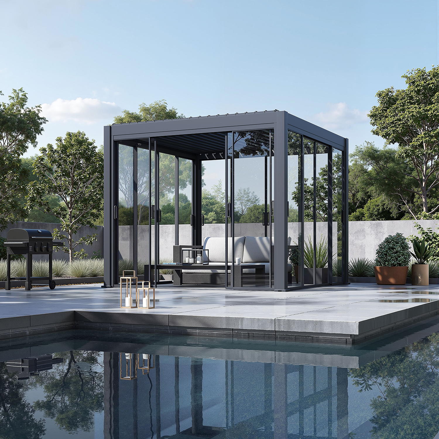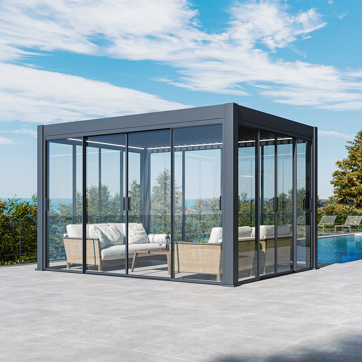 Pergola Seitenwand mit Glasschiebetüren – Wind- & Regenschutz | Anthrazit