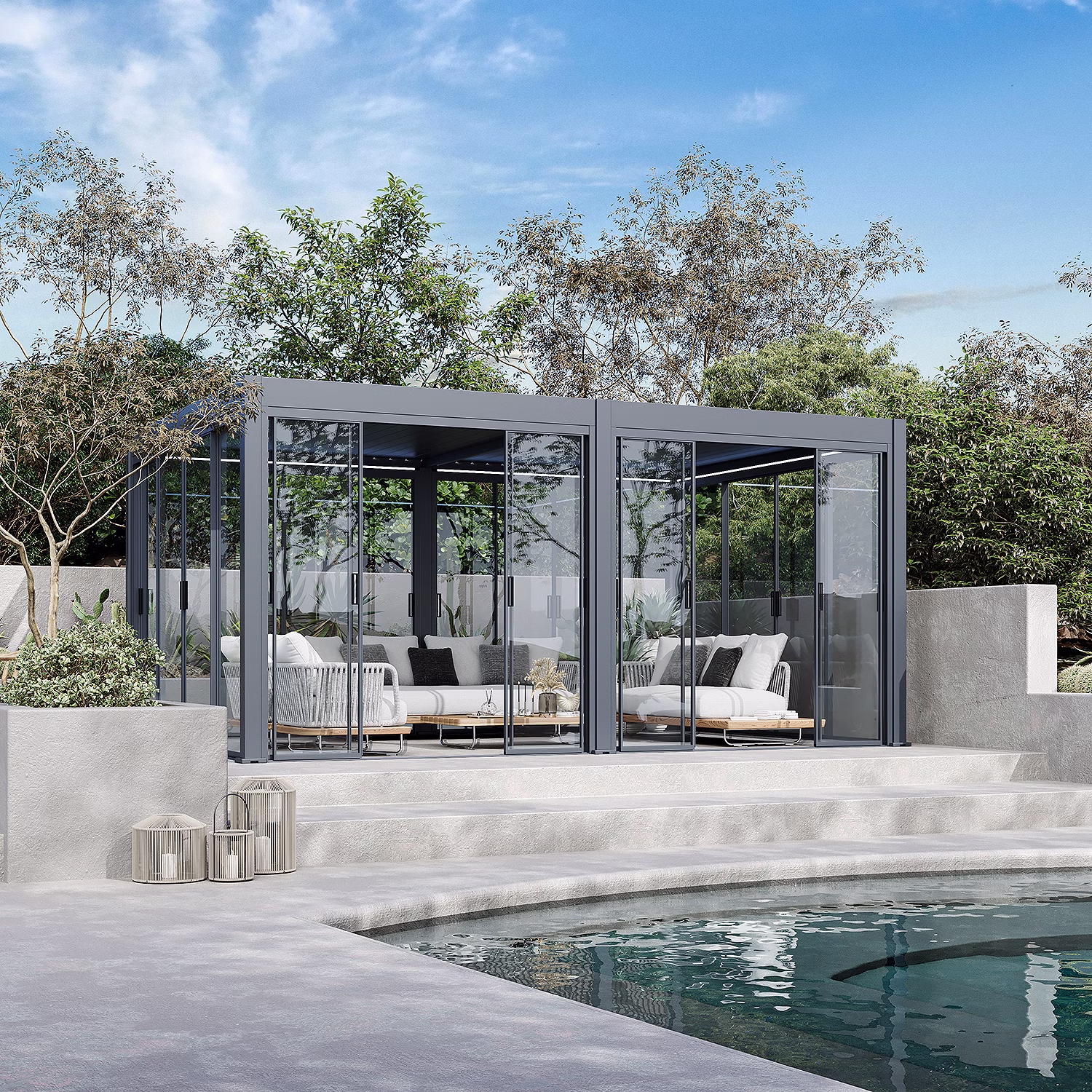 - Hochwertige Materialien: Aluminiumrahmen und Glaspaneele – langlebig, stabil und witterungsbeständig
