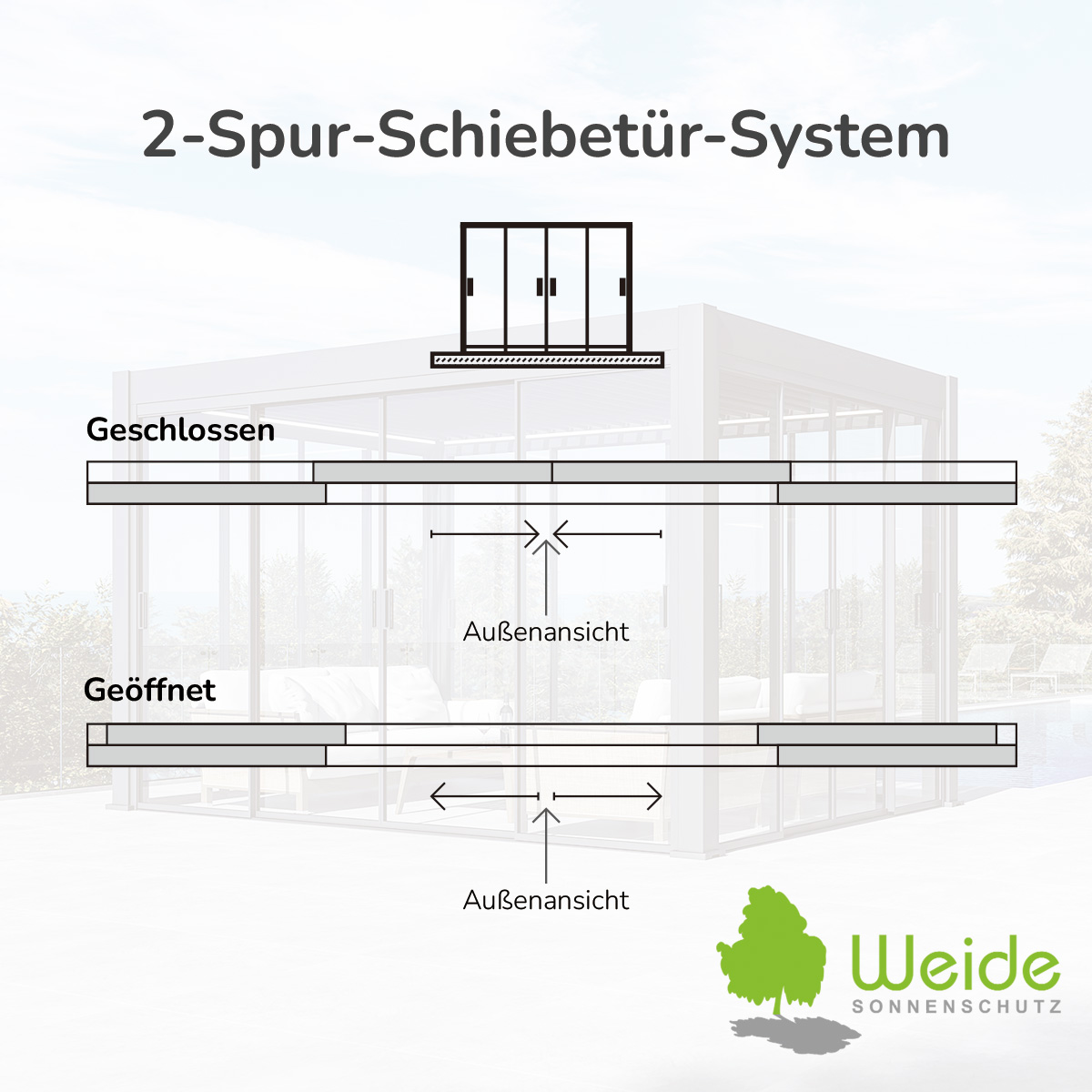 Unsere Weide Slimline Frame Glasschiebetüren verbinden modernes Design mit hoher Funktionalität. Zwei Laufschienen im schlanken Aluminiumrahmen ermöglichen das Verschieben der Glaspaneele in entgegengesetzte Richtungen und sorgen für ein symmetrisches, stilvolles Erscheinungsbild. Die Glasschiebetüren erweitern Ihre Pergola um eine elegante und funktionale Seitenlösung und bieten mehr Komfort und Flexibilität im Außenbereich.
